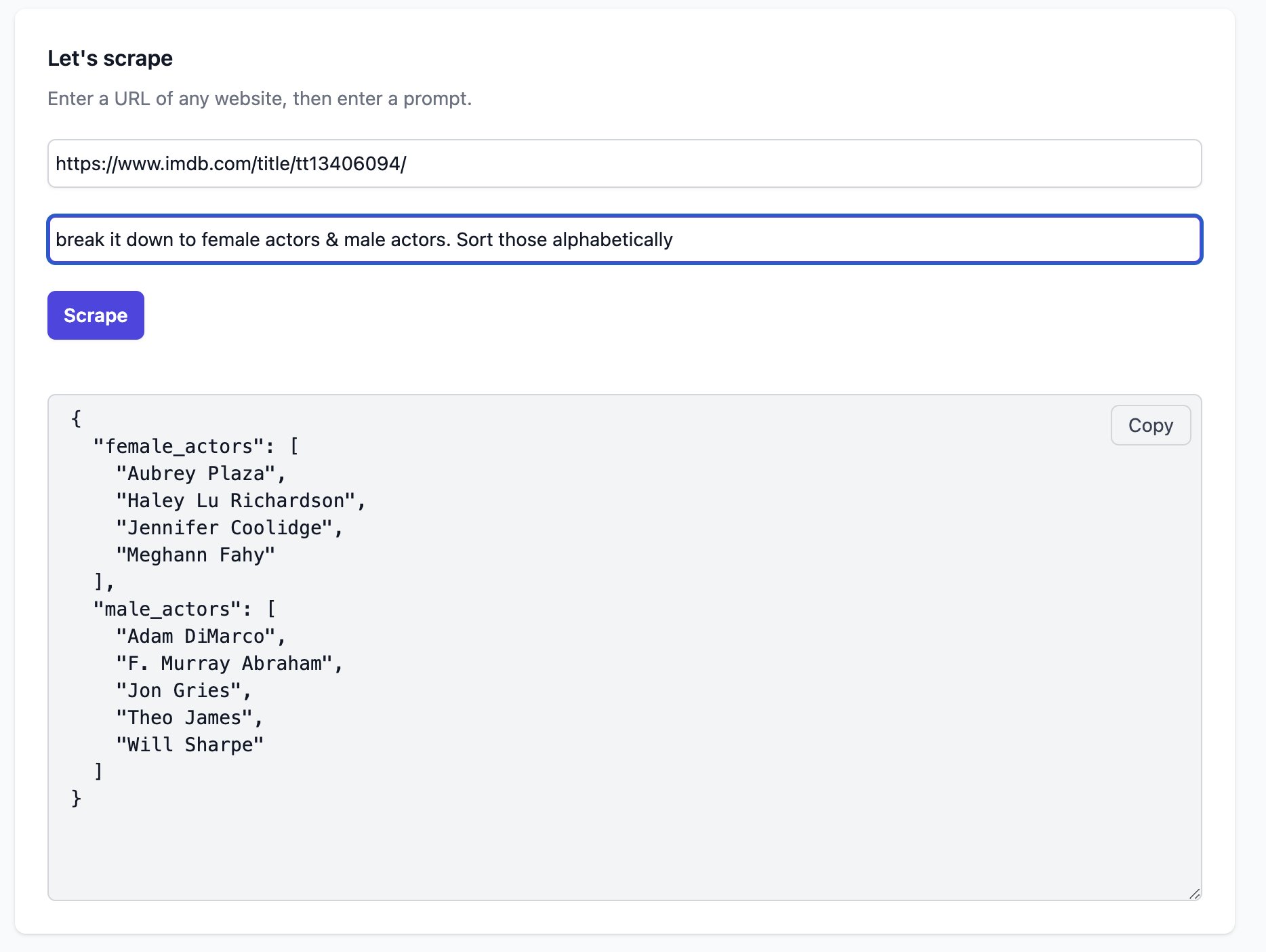 Given the above, I coded up a prototype that utilizes AI to help scrape any URL and return the results in JSON format. Here's what it looks like: